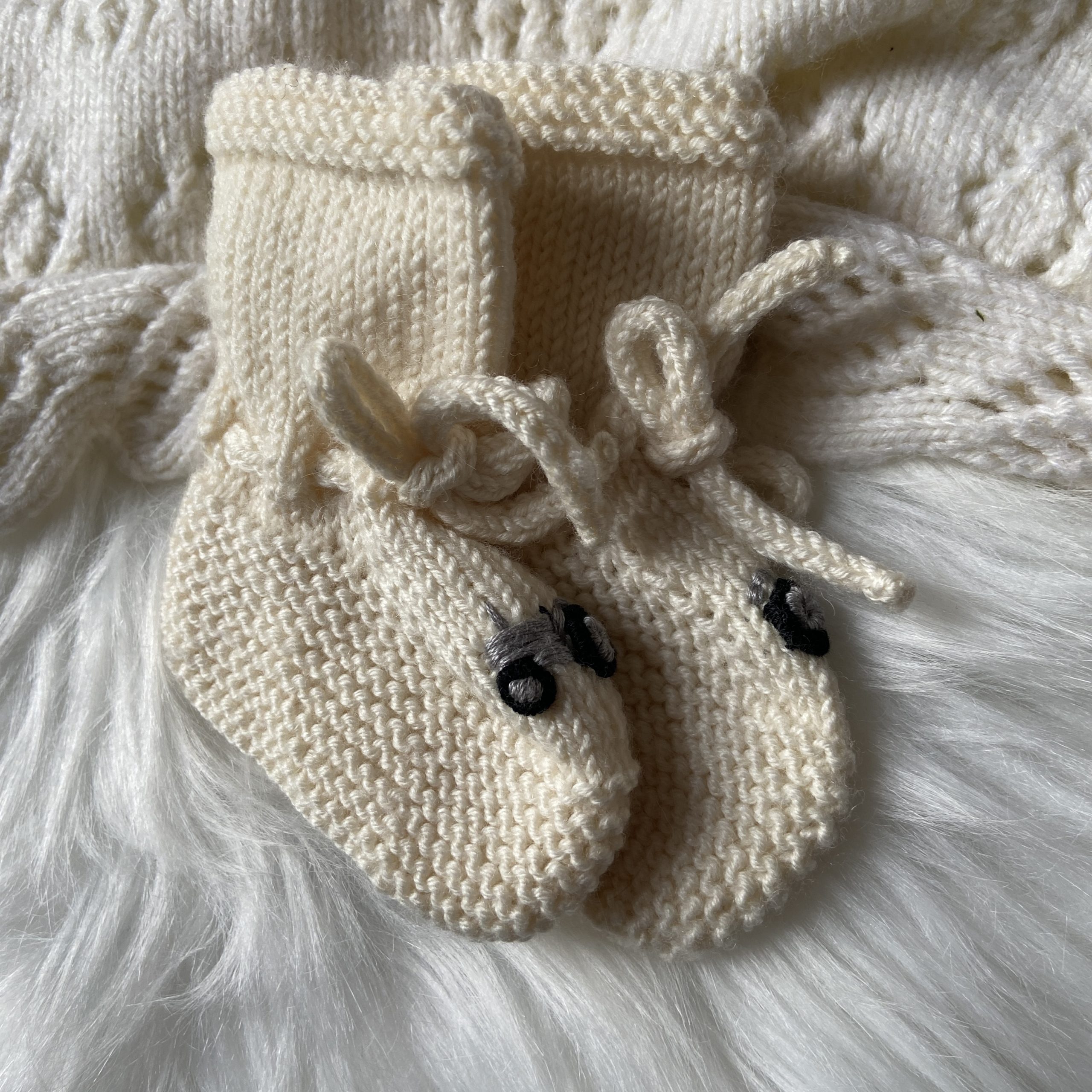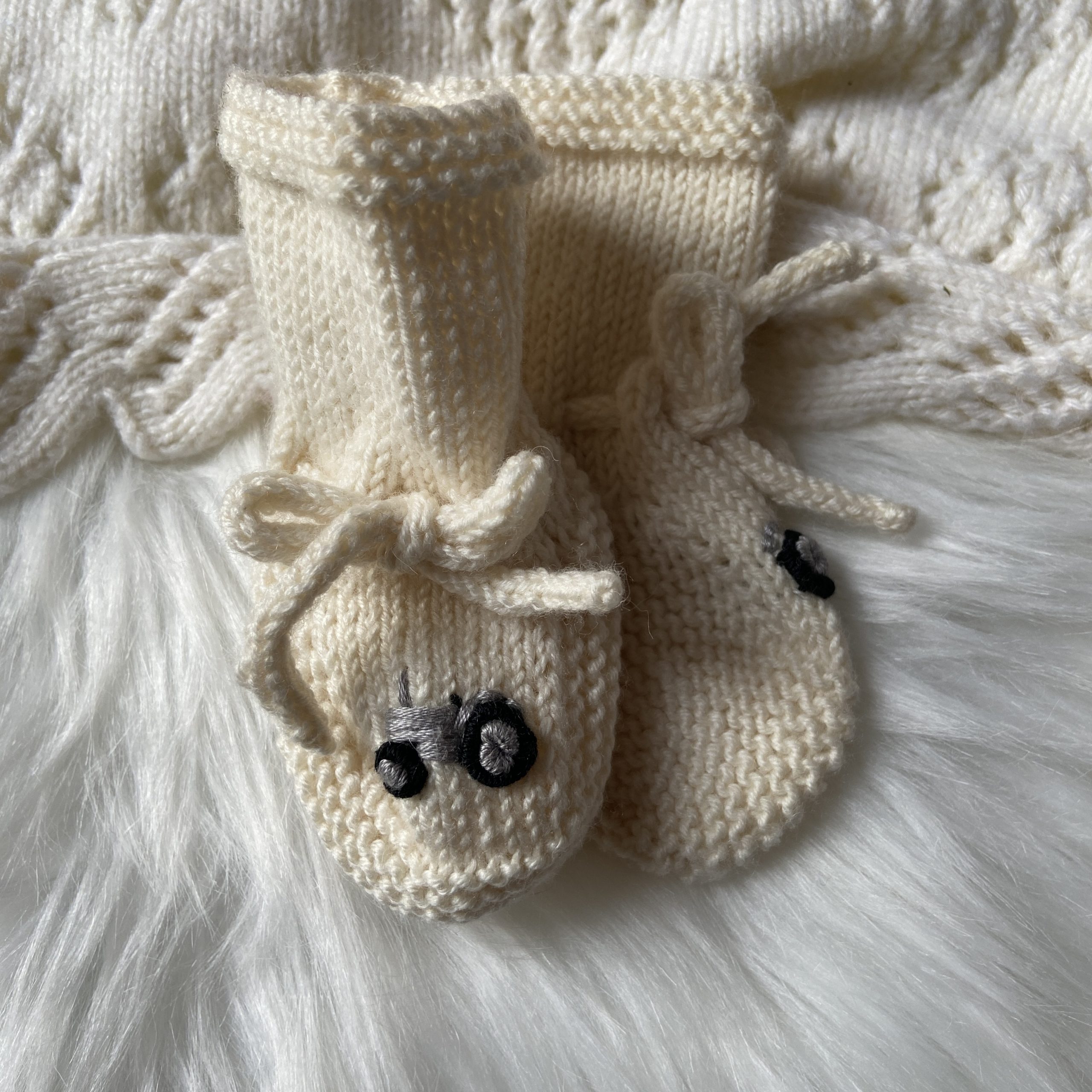 These hand knitted newborn baby booties are handmade in luxurious merino silk and cashmere blend yarn. The booties feature hand embroidered classic tractors on the front. Finished with matching hand knitted cord ties.